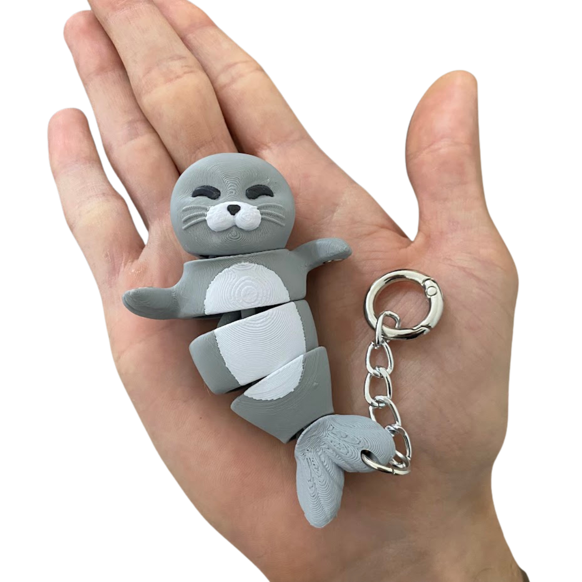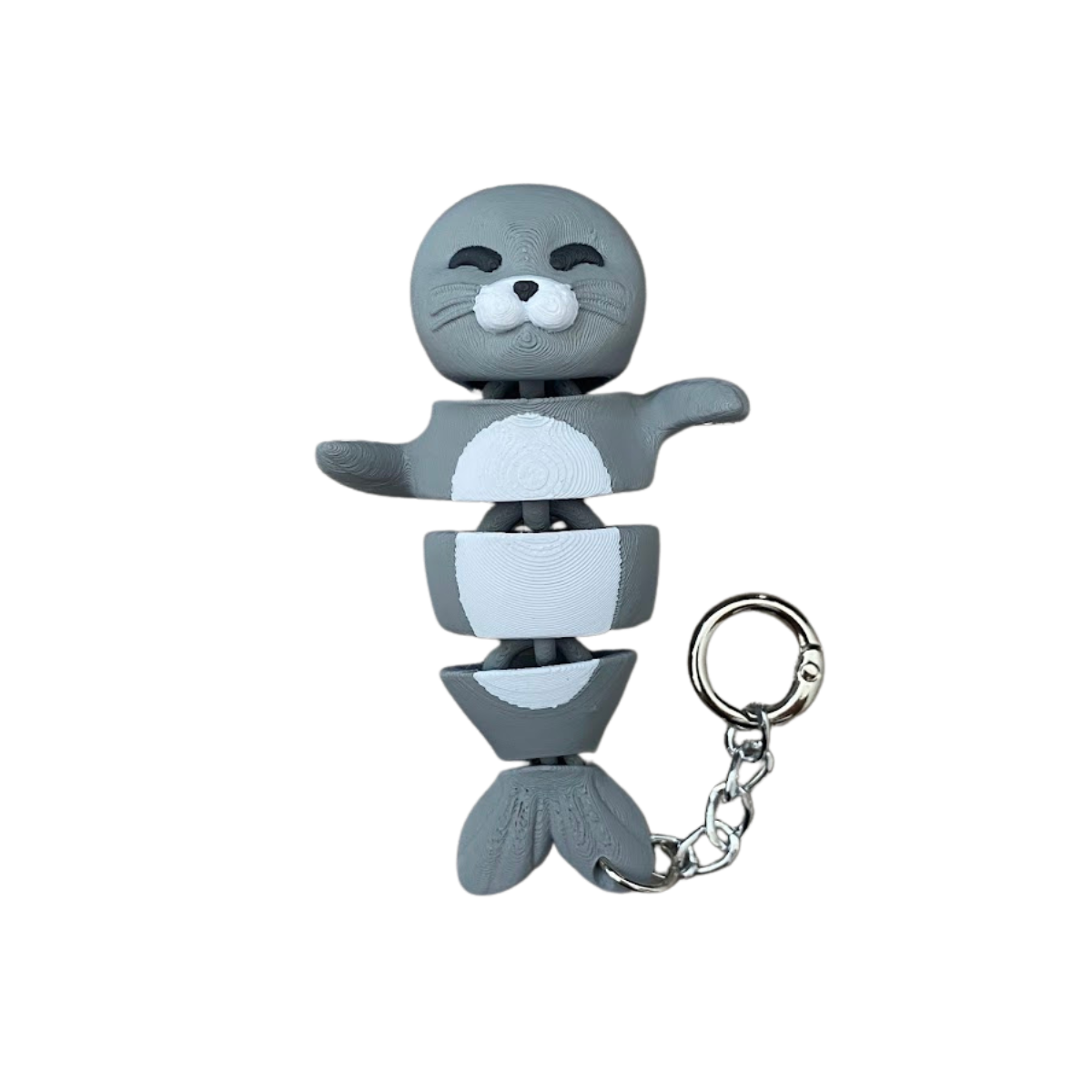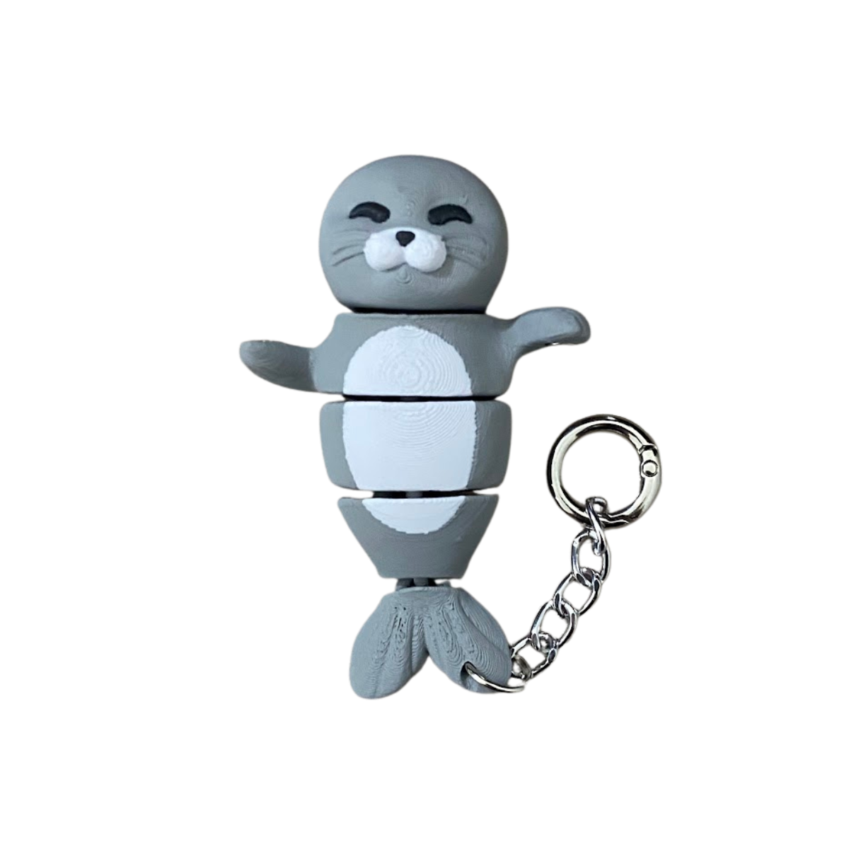 Sobre a Foquinha 🦭: Muito mais que um enfeite, ela é um chaveiro, fidget articulado e brinquedo interativo em uma só peça. Com ímãs nas patinhas, conecta-se a metais e outros companheiros da coleção. Seu corpo flexível é viciante de manusear, ideal para aliviar o estresse e dar personalidade ao seu estilo.